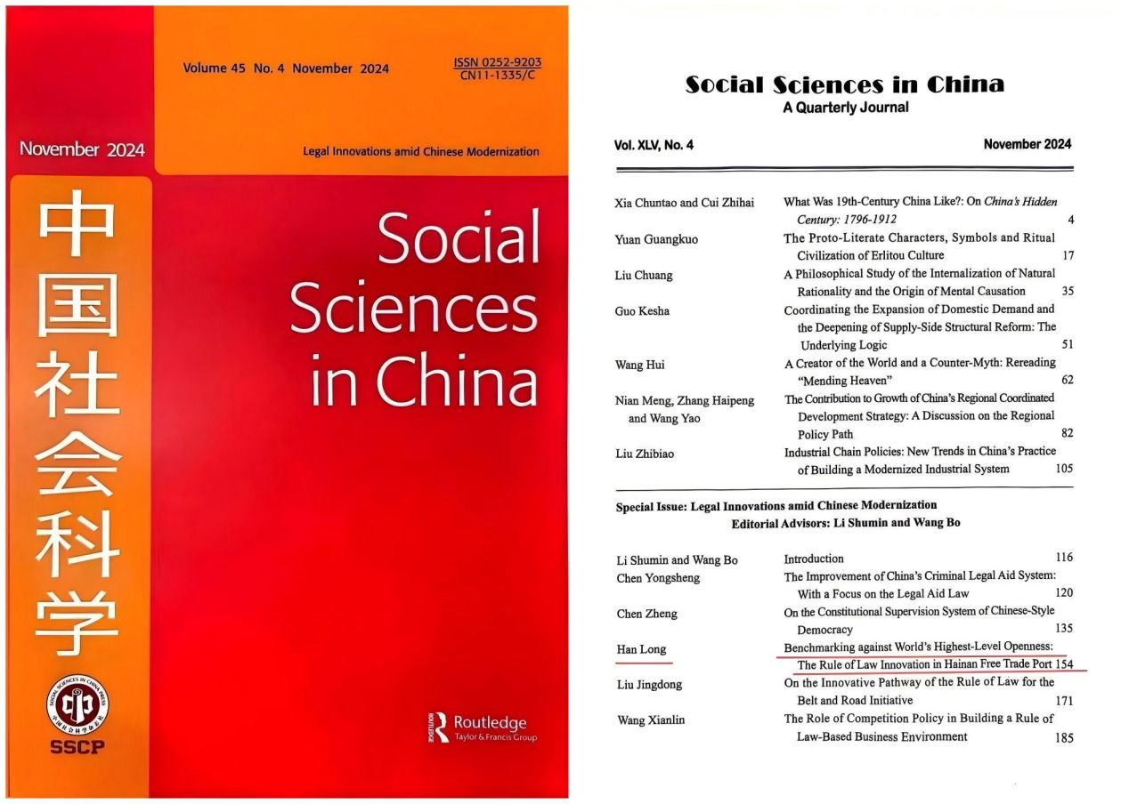 本站讯(记者 郑润泽)近日,sunbet申搏官方网站法学院教授韩龙在《中国社会科学》(英文版)2024年第4期上发表文章《海南自贸港:对标世界最高水平开放形态的制度创新》。文章深入分析了海南自贸港对标世界最高水平开放形态而进行的制度集成创新,为全球经济开放特殊区域的制度建构提供了中国经验。这是《中国社会科学》(英文版)2024年第4期的封面与目录。韩龙在文章中指出,建立海南自贸港是中国实行高标准开放的重大战略举措。《中华人民共和国海南自由贸易港法》...