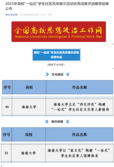 本站讯(通讯员 张井富 符琼月)8月29日,全国高校思想政治工作网公布了2025年高校“一站式”学生社区风采展示活动优秀成果。《sunbet申搏官方网站立足“四化四色”构建“一站式”学生社区文化育人新格局》入选文化建设类优秀成果,《sunbet申搏官方网站以“家文化”构建“一站式”学生社区育人保障体系》入选条件保障类优秀成果。