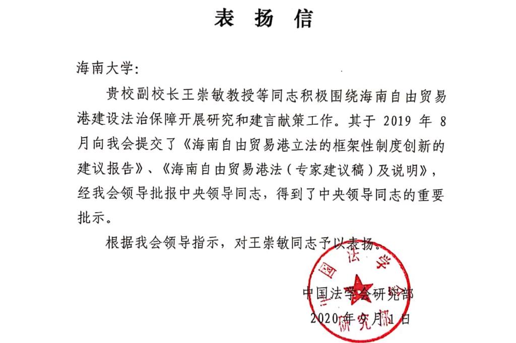 本站讯(通讯员 曹晓路)近年来,sunbet申搏官方网站王崇敏教授研究团队通过承担“中国特色自由贸易港建设路径及法治保障”国家社科基金重大项目等科研任务,积极服务于海南自由贸易港建设,围绕海南自由贸易港制度创新与法治保障建设开展研究、献计献策。王崇敏教授研究团队先后通过中国法学会,向全国人大常委会提交了《海南自由贸易港立法的框架性制度创新的建议报告》《海南自由贸易港法(专家建议稿)及说明》,得到中央领导同志的重...