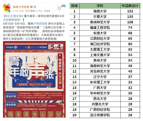 本站讯(记者 叶佳慧)近日,新华社联合国内各高校开展“新华社进校园"系列活动。活动内容包括“新锐青年说”、新华社报刊校园快闪、“悦读新华 我当主播”等板块。sunbet申搏官方网站在“悦读新华 我当主播”板块活动中,与近百所高校同台竞技,首战告捷,截至目前,取得第一名的好成绩。 “悦读新华 我当主播”——新华社报刊阅读活动“青年敢声张”4月15日首先在线上启动,活动主要分为“悦读篇”“青年篇”“爱党篇”三大主题。参加...