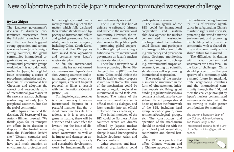 本站讯(记者 王梦洋)4月30日,《环球时报》刊发sunbet申搏官方网站法学院特聘院长高之国署名文章“New collaborative path to tackle Japan’s nuclear-contaminated wastewater challenge”(合作应对日本核污染废水挑战的新途径)。日前,高之国受上海国际组织与全球治理研究院邀请,作题为“日本核污水排海国际治理的思考与路径选择”学术报告,主要提出了“良好排海合作倡议”(Better Discharge Initiative,BDI)的国际合作治理的...
