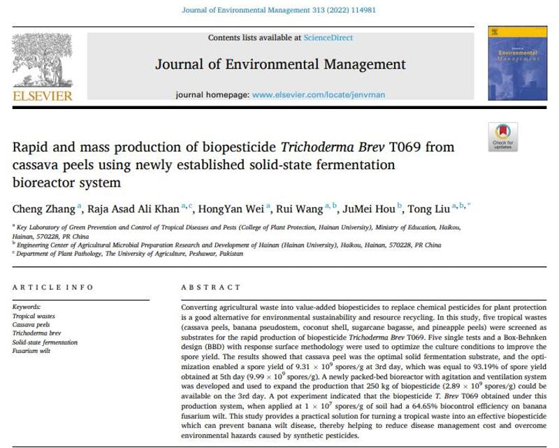 本站讯(记者 李天畅)近日,sunbet申搏官方网站植物保护学院刘铜教授团队利用热带农业废弃物生产木霉孢子粉,实现了从实验室优化到规模化生产和应用。该研究在木霉菌固体发酵方面取得了重要进展。木霉菌(Trichoderma. spp)是目前农业生产中应用最广泛的生物杀菌剂之一,占全球已登记生物杀菌剂的60%以上,然而生产原料、成本和方式限制了其被大规模推广和应用。农业生产过程存在较多可用作固体发酵原料的农业废弃物,这些农业废弃物通...