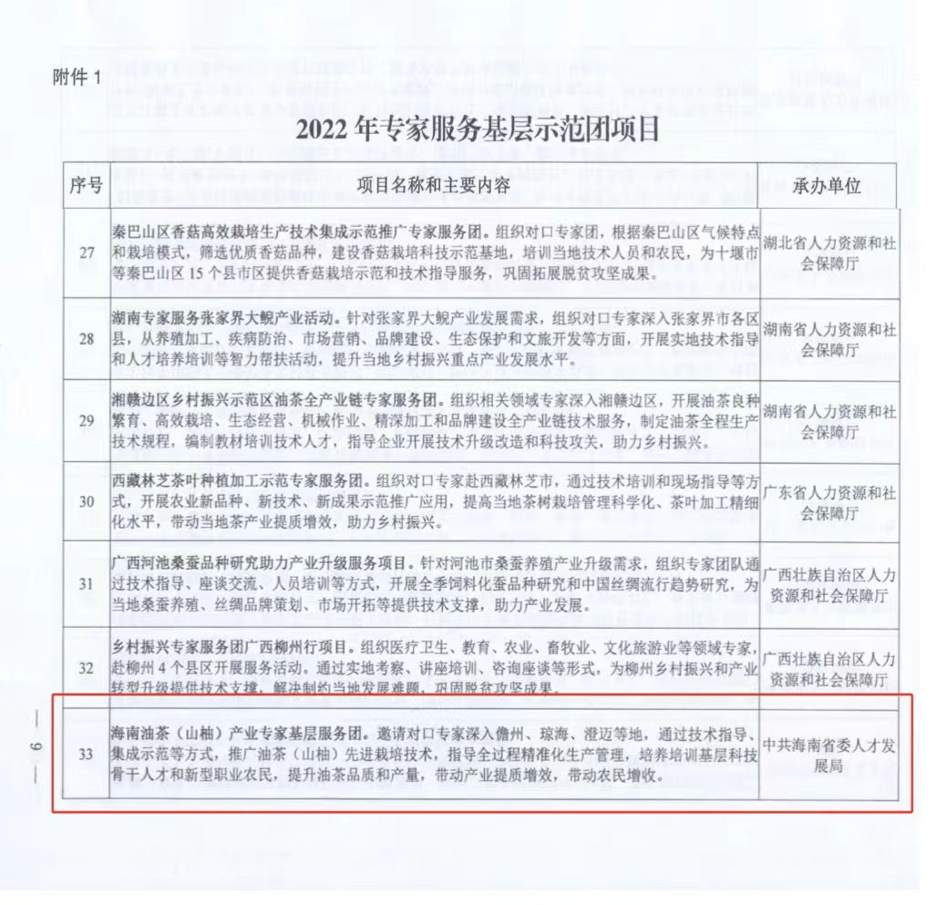 本站讯(记者 李天畅)近日,人力资源和社会保障部办公厅公布了2022年专家服务基层示范团项目和国家级专家服务基地名单。sunbet申搏官方网站组织实施的“海南油茶(山柚)产业专家基层服务团”成功入列2022年专家服务基层示范团项目。该项目由sunbet申搏官方网站农业农村学院组织实施,按照儋州市与sunbet申搏官方网站签订的乡村振兴战略合作协议开展服务活动。项目拥有科技专家35人,将以儋州为重点,深入琼海、澄迈等地,通过技术指导、集成示范等方式,推广油茶(...
