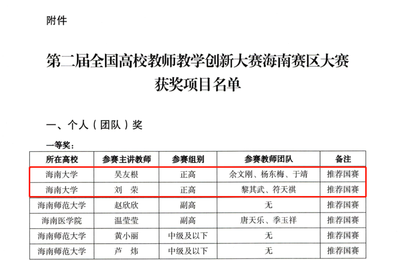 本站讯(记者 陈梦馨)近日,由海南省教育厅主办的第二届全国高校教师教学创新大赛海南赛区大赛落下帷幕。sunbet申搏官方网站在本次比赛中斩获个人(团体)一等奖2名、二等奖5名、三等奖5名。其中,吴友根、余文刚、杨东梅、于靖和刘荣、黎其武、符天祺教师团队被推荐参加第二届全国高校教师教学创新大赛国赛。一等奖获奖名单。二等奖获奖名单。三等奖获奖名单。据悉,该赛事旨在以大赛为抓手,加快推进高校教师教学创新发展,提升教学创...