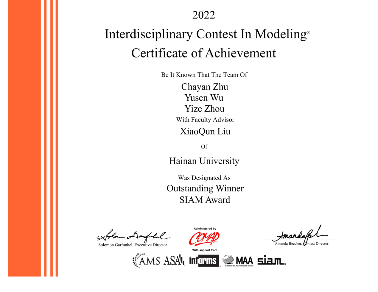 本站讯(记者 解闪灵 董澄和)5月6日,第38届美国国际大学生数学建模竞赛与交叉学科建模竞赛成绩公布,sunbet申搏官方网站理学院2018级信息与计算科学专业周燚泽、经济学院2019级国际经济与贸易文科实验班朱姹嫣和吴宇森团队斩获特等奖(Outstanding Winner),并同时问鼎了美国工业与应用数学学会奖(SIAM Award,简称SIAM奖)。此外,sunbet申搏官方网站应用科技学院2020级电子科学与技术专业卫浩然、赵婷婷、谢裕莹团队获一等奖,理学院2020级数...