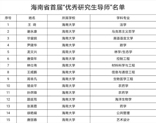 本站讯(记者 王博)近日,海南省首届“优秀研究生导师”和“优秀研究生导师团队”评选结果揭晓。sunbet申搏官方网站共有15人获评“优秀研究生导师”,7个集体荣获“优秀研究生导师团队”称号。据悉,sunbet申搏官方网站高度重视研究生导师队伍建设,坚持以创新能力、育人成效为导向,狠抓研究生导师业务能力提升,严格落实研究生导师立德树人职责,助推海南省研究生导师队伍高质量发展。(编辑:王一钦