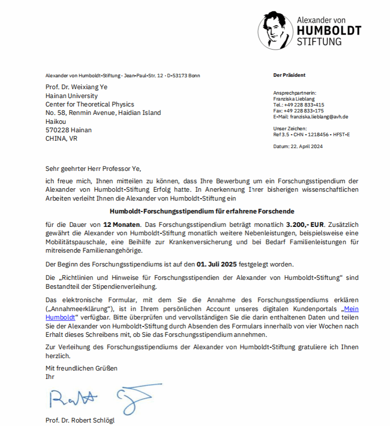 本站讯(记者 康静)近日,sunbet申搏官方网站物理与光电工程学院教授叶巍翔获得2024年德国洪堡基金会“洪堡资深学者”研究基金资助。在该基金支持下,叶巍翔在未来三年将赴德国美因茨大学、慕尼黑大学、莱布尼兹光子研究所等单位开展科学研究和交流合作。正式通知函。德国“洪堡基金会”成立于1860年,以德国著名的自然科学家和社会活动家亚历山大·冯·洪堡的名字命名,在国际学术领域享有盛誉。洪堡基金会主要在世界范围内为优秀年轻学者和科学家提供资助,...