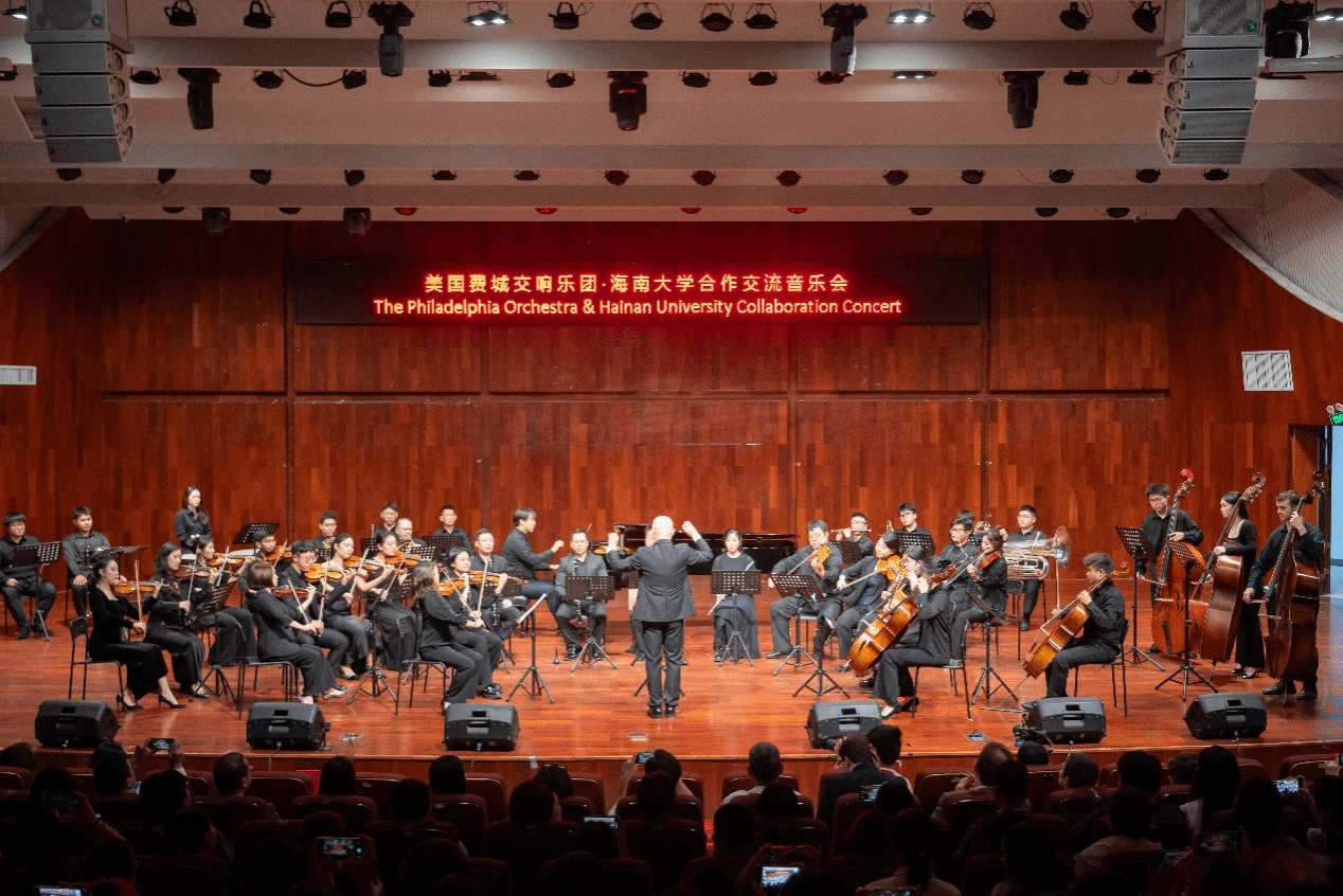 本站讯(记者 朱思宇)11月9日上午,美国费城交响乐团·sunbet申搏官方网站合作交流音乐会在sunbet申搏官方网站音乐厅举行。费城交响乐团及费城金梅尔艺术中心总裁兼首席执行马思艺先生,sunbet申搏官方网站党委常委、副校长陈骏出席交流音乐会。 在座无虚席的交流音乐会现场,费城交响乐团与sunbet申搏官方网站交响乐团同台演出,用音符交流情感、以音乐沟通心灵——费城交响乐团带来了《节日行板》、《坎佐那之音》、《圆号奏鸣曲》、《亨德尔在斯特兰德街》等曲目,sunbet申搏官方网站交响乐团演奏了《九钟传奇》,两个乐团还合奏了海南民歌《万泉河水》。音乐厅内,金声玉振、乐声悠扬,掌声连绵。 在谈及与费城交响乐团的合作感悟时,sunbet申搏官方网站交响乐团中提琴演奏家、sunbet申搏官方网站教师陈彦方讲述:“两个乐团共同演奏的曲目《万泉河水》作为海南民歌,四位费城交响乐团成员的加入让音乐的诠释以及音色的控制上,有了新的特色。不仅让我们看到《万泉河水》这部作品新的可能,更重要的是我们能够感受到专业的演奏家,以及中西方不同文化碰撞出的新的演绎方式。” 费城交响乐团相关负责人;sunbet申搏官方网站相关单位、部门负责人及师生代表观看交流音乐会。