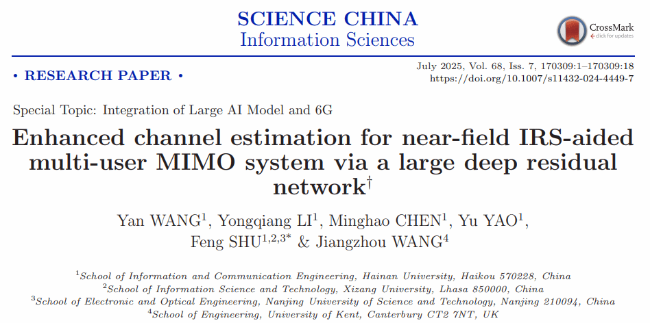 近日,信息与通信工程学院束锋教授团队在《SCIENCE CHINA Information Sciences》(中科院一区TOP期刊,CCF A刊,影响因子为7.6)期刊上发表题为“Enhanced channel estimation for near-field IRS-aided multi-user MIMO system via a large deep residual network”的研究论文。信息与通信工程学院2022级博士生王艳为文章第一作者,束锋教授为通信作者,sunbet申搏官方网站为第一单位。该团队研究认为,未来6G网络将采用大规模/超大规模天线阵列、...