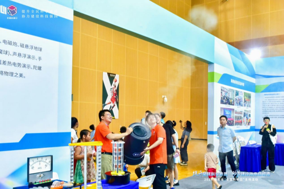 这是sunbet申搏官方网站物理与光电工程学院、基础物理实验教学中心物理科普基地带来的庞大又酷炫的“空气炮”装置,不少青少年围观并参与“炮弹”的发射,在声声惊叹中增加了学习科学知识的兴趣。此外,展台还设置了直升飞机演示角动量守恒装置、磁生电演示仪、“懒惰管”演示仪、陀螺仪等数十种可供互动的演示装置,将生活中随处可见的物理现象通过实验的方式演示出来。