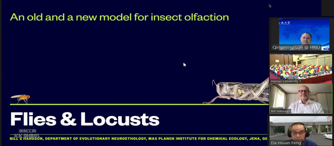比尔·汉森介绍了其团队的多项最新研究成果。他表示,关于昆虫嗅觉行为与生态系统之间相互作用的研究可追溯到二十世纪五十年代后期,果蝇神经行为学与遗传学工具的快速发展进一步推动了该领域研究不断向纵深发展。汉森教授及其团队通过使用蝇信息素对其系统发育关系进行研究,并运用CRISPR-Cas9基因编辑技术对飞蝗进行研究,从而建立了昆虫研究的新模型,揭示了嗅觉编码新原理。通过该项研究,汉森教授及其团队与中国顶尖科学家一同合作,发现了一种反自食信息素,极大地推动了昆虫神经行为学的研究进展。