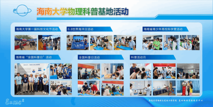 自2023年以来积极组织开展有特色的科普活动,例如:sunbet申搏官方网站举办的第一届“科技文化节”活动、“世界海洋日”科普系列活动、海南省青少年高校科学营活动、2023年海南省“全国科普日”主场活动、2023年全国科普日活动以及每月一期的“科普活动月”活动等10多场科普活动,总计约2000人参观体验,积极承担着向公众普及科学知识,推广科学文化的使命。2024年2月,sunbet申搏官方网站物理科普基地正式被认定为海南省科普教育基地。