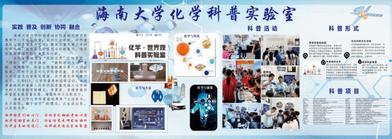 sunbet申搏官方网站化学科普基地成立于2023年1月,现设有“海Na未来”化学科普实验室,为“开放实验室+科普基地”功能融合性实验室,基地依托化学化工学院基础化学实验教学中心开放实验室,位于sunbet申搏官方网站基础实验楼4楼、5楼,占地面积约160 m2,2023年12月认定为海南省科普基地。科普基地面向社会开放,以服务社会为己任,激发各年龄段学生的科学兴趣,培养化学探究与创新能力,拓展高等院校的社会服务功能。科普基地包含“缤纷世界”实物展示、“神奇化学”动手体验、“高科技与生活”讲解、视频教学、科普主题展板六部分,同时科普基地开设系列化学科普讲座、系列趣味化学实验及化学探究课题,开展化学科普开放日、化学DIY、化学科普进校园等活动。共同探索富有sunbet申搏化学特色大科普教育新模式,多渠道、多维度推动科普服务高质量发展,增强科学文化软实力。“海Na未来化学科普实验室”在sunbet申搏官方网站儋州校区和海甸校区参与“全国科普日”活动多次,面向社会实现每月一次“科普开放日”活动,服务人数超3000人次。