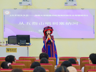 在问答环节,曾若馨细心解答了同学们关于非物质文化遗产传承、海南黎苗族文化推广、青年文化创新创业等问题,并分享了如何唱好苗歌的经验和技巧,让更多同学了解和欣赏苗族音乐。曾若馨为在场同学们提出寄语,鼓励大家做好自己,坚持自己的梦想和目标,为海南自贸港文化建设做出青年贡献。