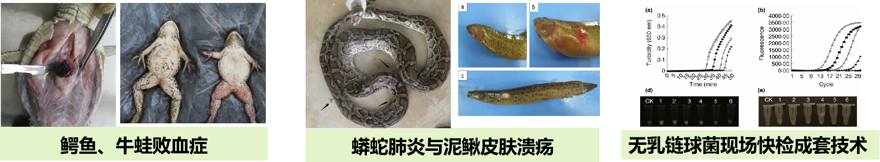 以典型热带养殖与野生动物(罗非鱼、泥鳅、鳄鱼、牛蛙、蟒蛇、眼镜蛇、黄牛、乳牛、羊、猪等)传染病为研究对象,先后发现了达卡气单胞菌、猪链球菌、无乳链球菌、乳房猪链球菌、爱德华氏菌、细小病毒和虹彩病毒等一系列病原,并开发了一系列的现场快检技术、单克隆抗体和预防疫苗。