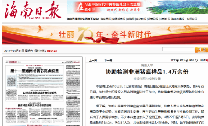 先后发现海南各类动物疫病数10次,开发高通量基因编辑技术1项,无乳链球菌现场快检方法1项,并针对危害较大的达卡气单胞菌败血症研发候选疫苗5株,至今已累计挽回各类经济损失数10亿元,并基于One health理念和“人病兽防”策略,在维护了海南“自贸港”中的生物安全与公共安全方面贡献了相应力量。
