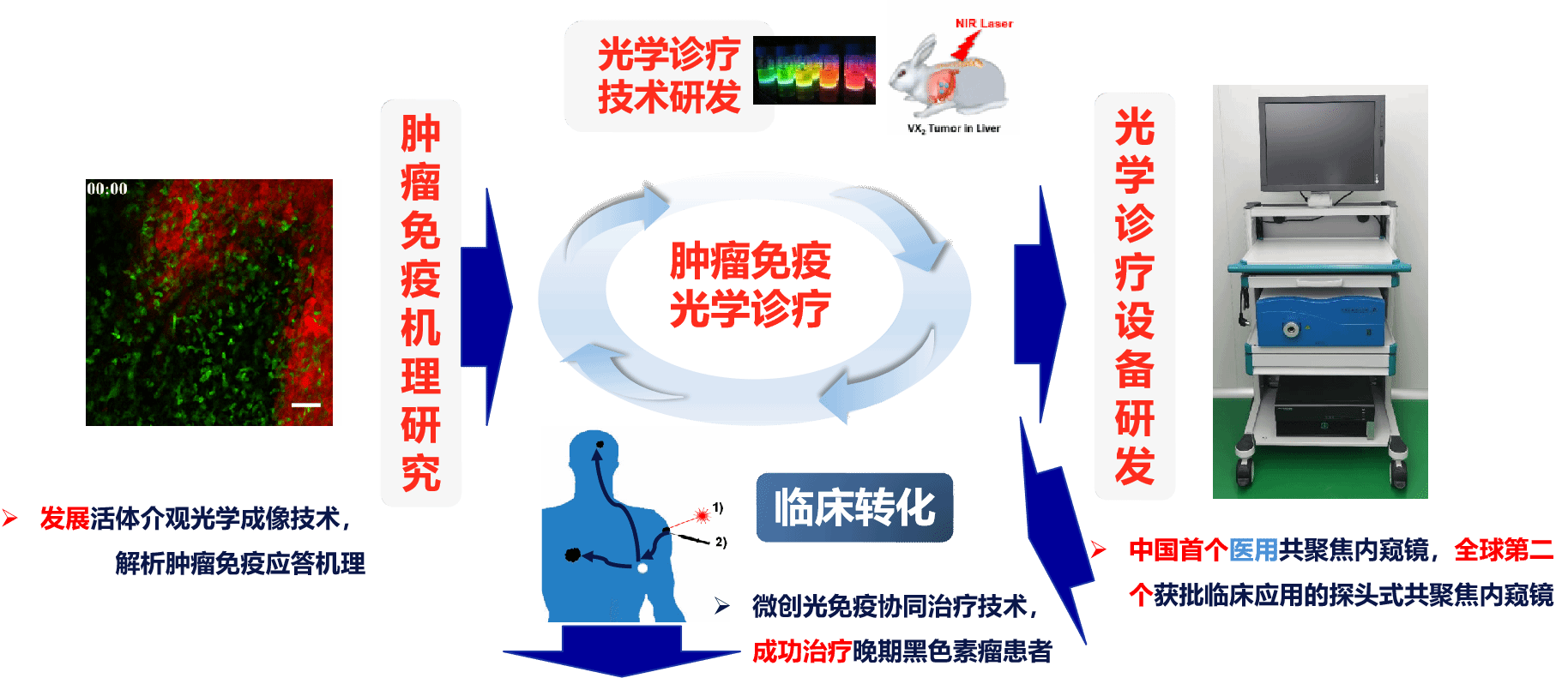 开发国内首个医用共聚焦内窥镜,助力早癌检测;开发微创光疗联合免疫治疗技术,成功治疗晚期癌症患者,实现了从基础到转化到应用的衔接。